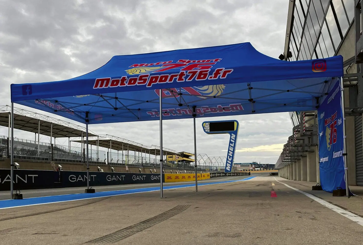 Le barnum personnalisé est un moyen d’afficher les couleurs de votre team, ou de vos partenaires et entreprises tout en profitant de tous ses avantages. En plus de vous abriter du soleil et des intempéries en extérieur, il vous permettra de délimiter votre espace sur les paddocks de circuit.