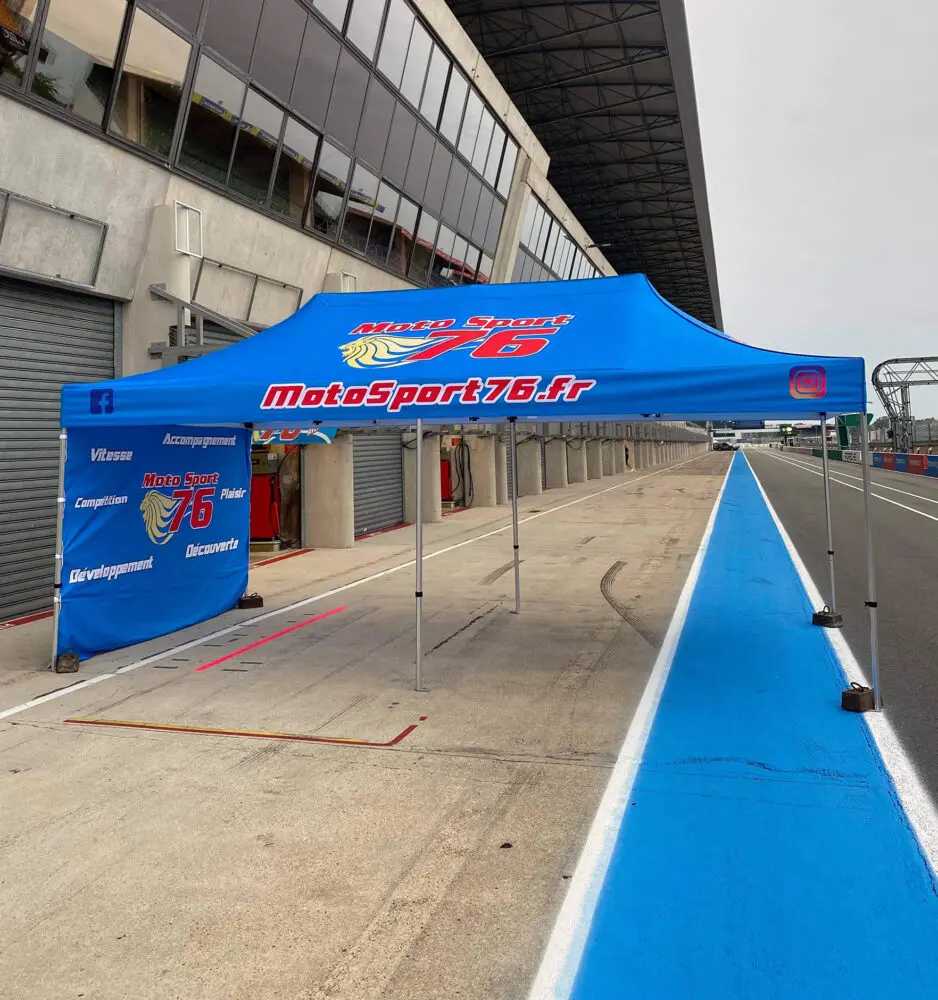 Le barnum personnalisé est un moyen d’afficher les couleurs de votre team, ou de vos partenaires et entreprises tout en profitant de tous ses avantages. En plus de vous abriter du soleil et des intempéries en extérieur, il vous permettra de délimiter votre espace sur les paddocks de circuit.