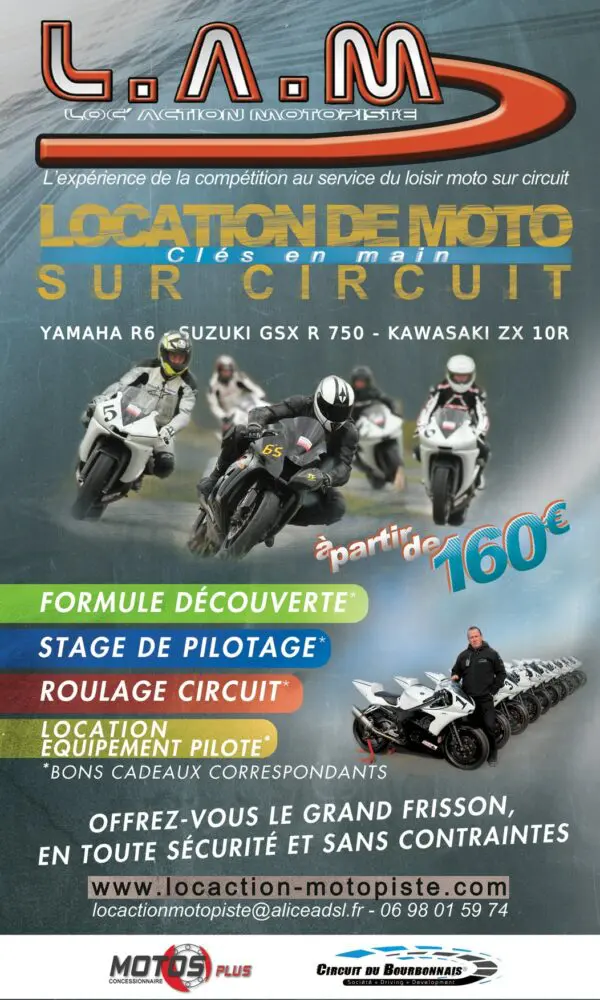 Avec 10 années d’expérience dans la location de moto de piste et l’initiation du pilotage dans cette discipline, L.A.M propose sur le circuit du Bourbonnais à Moulins 03 ainsi que sur les pistes de Bresse, Issoire, Lurcy-Lévis, Magny-cours, Val de Vienne…